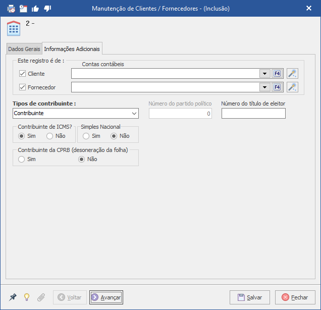 Nas Informações Adicionais você define se o registro é de cliente ou fornecedor e a conta contábil que o define: