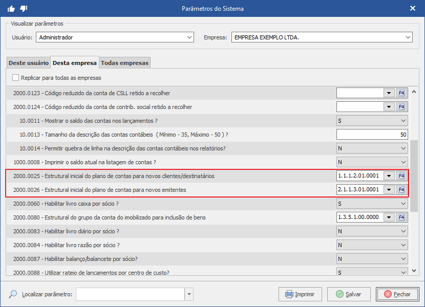 Existem dois parâmetros que devem ser definidos pelo usuário MASTER e que determinam qual o estrutural inicial do plano de contas para novos emitentes ou destinatários