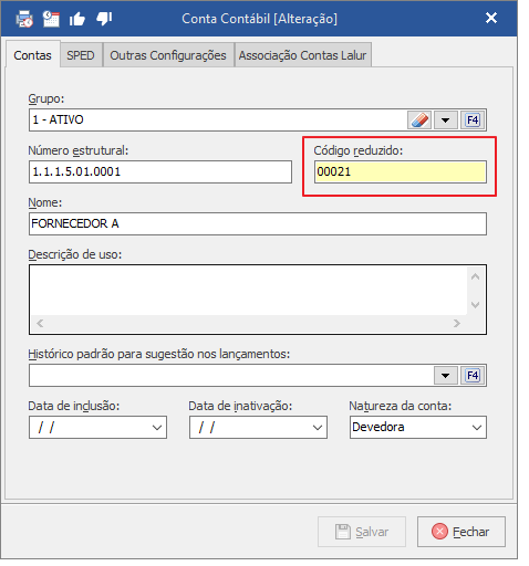 O código reduzido serve para identificar o fornecedor/cliente no ContabMilenium e está disponível na aba Contas do cadastro de contas contábeis;